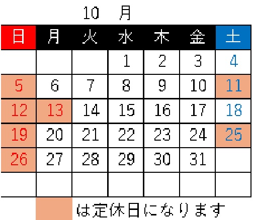 10月は 第2.第4土曜日と毎週日曜日 13日(祝日) が定休日になります